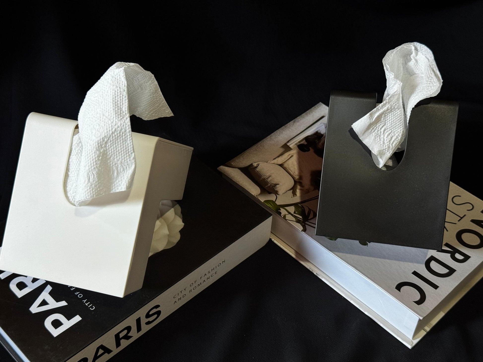 modern L-shaped tissue box in a sleek black and white design—minimalist, stylish, and perfect as a functional accent for any room.