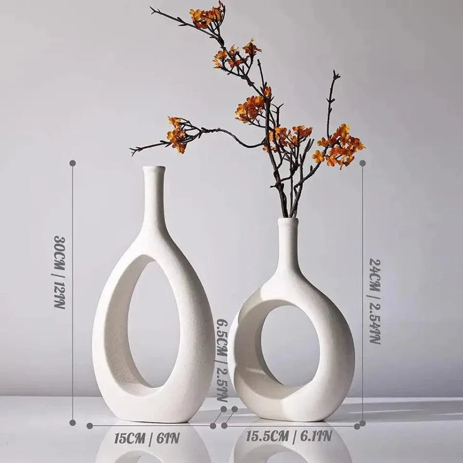 2 PCS. Set of 2 White Ceramic Hollow Circular Intersecting Vases – Modern Minimalist Décor